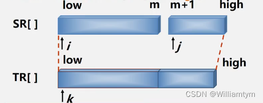 设R[low]-R[mid]和R[mid+1]-R[high]为相邻,归并成一个有序序列R1[low]-R1[high]。