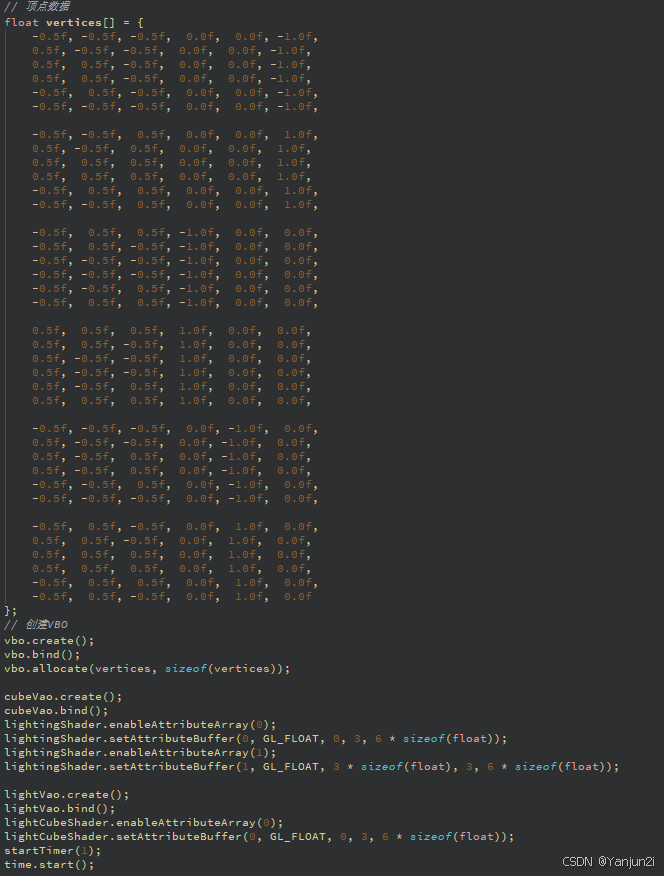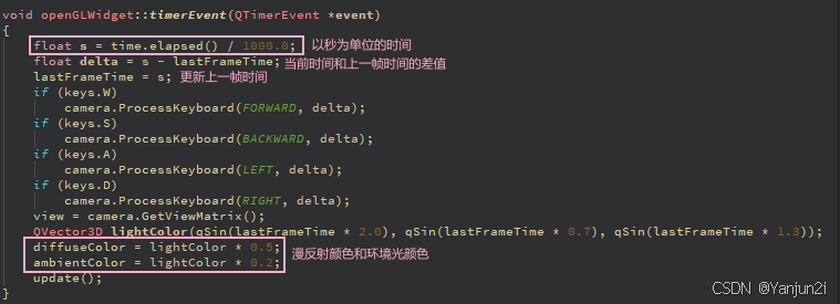 #ifndef OPENGLWIDGET_H #define OPENGLWIDGET_H #include #include #include #include #include #include #include "Camera.h" QT_BEGIN_NAMESPACE namespace Ui { class openGLWidget; } QT_END_NAMESPACE class openGLWidget : public QOpenGLWidget { Q_OBJECT public: openGLWidget(QWidget *parent = nullptr); ~openGLWidget(); protected: virtual void timerEvent(QTimerEvent *event) override; //鼠标事件 virtual void enterEvent(QEnterEvent *event) override; virtual void leaveEvent(QEvent *event) override; virtual void mouseMoveEvent(QMouseEvent *event) override; virtual void wheelEvent(QWheelEvent *event) override; virtual void keyPressEvent(QKeyEvent *event) override; virtual void keyReleaseEvent(QKeyEvent *event) override; //初始化 virtual void initializeGL() override; virtual void resizeGL(int w, int h) override; virtual void paintGL() override; private: QOpenGLShaderProgram lightingShader; QOpenGLShaderProgram lightCubeShader; QOpenGLBuffer vbo; QOpenGLVertexArrayObject cubeVao; QOpenGLVertexArrayObject lightVao; QMatrix4x4 projection; QMatrix4x4 view; Camera camera {Camera(QVector3D(0.0f, 0.0f, 3.0f))}; QVector3D lightPos {QVector3D(1.2f, 1.0f, 2.0f)}; // 用 0 - 1 的值 直接表示颜色 QVector3D diffuseColor; QVector3D ambientColor; QElapsedTimer time; float lastFrameTime {0.f}; struct { bool W {false}; bool S {false}; bool A {false}; bool D {false}; } keys; private: Ui::openGLWidget *ui; }; #endif // OPENGLWIDGET_H