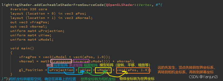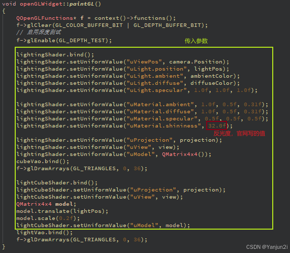 镜面反射光主要是模拟物体表面的高光效果。通过计算反射方向向量和观察方向向量的点积,并对结果进行幂运算,来模拟高光的集中和锐利程度。材质的 shininess 值越大,高光就越集中和锐利。