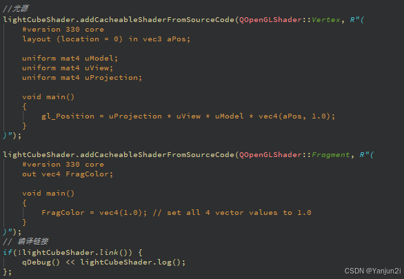 #include "openGLWidget.h" #include "./ui_openGLWidget.h" #include #include #include #include openGLWidget::openGLWidget(QWidget *parent) : QOpenGLWidget(parent) , ui(new Ui::openGLWidget) { ui->setupUi(this); setMouseTracking(true); } openGLWidget::~openGLWidget() { makeCurrent(); lightVao.destroy(); cubeVao.destroy(); vbo.destroy(); doneCurrent(); delete ui; } void openGLWidget::timerEvent(QTimerEvent *event) { float s = time.elapsed() / 1000.0; float delta = s - lastFrameTime; lastFrameTime = s; if (keys.W) camera.ProcessKeyboard(FORWARD, delta); if (keys.S) camera.ProcessKeyboard(BACKWARD, delta); if (keys.A) camera.ProcessKeyboard(LEFT, delta); if (keys.D) camera.ProcessKeyboard(RIGHT, delta); view = camera.GetViewMatrix(); QVector3D lightColor(qSin(lastFrameTime * 2.0), qSin(lastFrameTime * 0.7), qSin(lastFrameTime * 1.3)); diffuseColor = lightColor * 0.5; ambientColor = lightColor * 0.2; update(); } void openGLWidget::enterEvent(QEnterEvent *event) { // 隐藏鼠标指针,将指针置于窗口中心 setCursor(Qt::BlankCursor); QCursor::setPos(mapToGlobal(rect().center())); } void openGLWidget::leaveEvent(QEvent *event) { } void openGLWidget::mouseMoveEvent(QMouseEvent *event) { float xoffset = rect().center().x() - event->x(); float yoffset = rect().center().y() - event->y(); float sensitivity = 0.1f; // change this value to your liking xoffset *= sensitivity; yoffset *= sensitivity; camera.ProcessMouseMovement(xoffset, yoffset); // 将指针置于窗口中心 QCursor::setPos(mapToGlobal(rect().center())); } void openGLWidget::wheelEvent(QWheelEvent *event) { float f = event->angleDelta().y() > 0 ? 1.0f : -1.0f; camera.ProcessMouseScroll(f); projection.setToIdentity(); projection.perspective(camera.Zoom, float(width()) / float(height()), 0.1f, 100.f); } void openGLWidget::keyPressEvent(QKeyEvent *event) { switch(event->key()) { case Qt::Key_W: keys.W = true; break; case Qt::Key_S: keys.S = true; break; case Qt::Key_A: keys.A = true; break; case Qt::Key_D: keys.D = true; break; default: return; } } void openGLWidget::keyReleaseEvent(QKeyEvent *event) { switch(event->key()) { case Qt::Key_W: keys.W = false; break; case Qt::Key_S: keys.S = false; break; case Qt::Key_A: keys.A = false; break; case Qt::Key_D: keys.D = false; break; default: return; } } void openGLWidget::initializeGL() { // 设置用来清空屏幕的颜色 这里设置为黑色 QOpenGLFunctions *f = context()->functions(); f->glClearColor(0.0f, 0.0f, 0.0f, 0.0f); lightingShader.addCacheableShaderFromSourceCode(QOpenGLShader::Vertex, R"( #version 330 core layout (location = 0) in vec3 aPos; layout (location = 1) in vec3 aNormal; out vec3 vFragPos; out vec3 vNormal; uniform mat4 uProjection; uniform mat4 uView; uniform mat4 uModel; void main() { vFragPos = vec3(uModel * vec4(aPos, 1.0)); vNormal = mat3(transpose(inverse(uModel))) * aNormal; gl_Position = uProjection * uView * uModel * vec4(aPos, 1.0); } )"); // 片段着色器 lightingShader.addCacheableShaderFromSourceCode(QOpenGLShader::Fragment, R"( #version 330 core out vec4 FragColor; struct Material { vec3 ambient; vec3 diffuse; vec3 specular; float shininess; }; struct Light { vec3 position; vec3 ambient; vec3 diffuse; vec3 specular; }; in vec3 vNormal; in vec3 vFragPos; uniform vec3 uViewPos; uniform Material uMaterial; uniform Light uLight; void main() { // ambient vec3 ambient = uLight.ambient * uMaterial.ambient; // diffuse vec3 norm = normalize(vNormal); vec3 lightDir = normalize(uLight.position - vFragPos); float diff = max(dot(norm, lightDir), 0.0); vec3 diffuse = uLight.diffuse * (diff * uMaterial.diffuse); // specular vec3 viewDir = normalize(uViewPos - vFragPos); vec3 reflectDir = reflect(-lightDir, norm); float spec = pow(max(dot(viewDir, reflectDir), 0.0), uMaterial.shininess); vec3 specular = uLight.specular * (spec * uMaterial.specular); vec3 result = ambient + diffuse + specular; FragColor = vec4(result, 1.0); } )"); // 编译链接 if(!lightingShader.link()) { qDebug() << lightingShader.log(); }; //光源 lightCubeShader.addCacheableShaderFromSourceCode(QOpenGLShader::Vertex, R"( #version 330 core layout (location = 0) in vec3 aPos; uniform mat4 uModel; uniform mat4 uView; uniform mat4 uProjection; void main() { gl_Position = uProjection * uView * uModel * vec4(aPos, 1.0); } )"); lightCubeShader.addCacheableShaderFromSourceCode(QOpenGLShader::Fragment, R"( #version 330 core out vec4 FragColor; void main() { FragColor = vec4(1.0); // set all 4 vector values to 1.0 } )"); // 编译链接 if(!lightCubeShader.link()) { qDebug() << lightCubeShader.log(); }; // 顶点数据 float vertices[] = { -0.5f, -0.5f, -0.5f, 0.0f, 0.0f, -1.0f, 0.5f, -0.5f, -0.5f, 0.0f, 0.0f, -1.0f, 0.5f, 0.5f, -0.5f, 0.0f, 0.0f, -1.0f, 0.5f, 0.5f, -0.5f, 0.0f, 0.0f, -1.0f, -0.5f, 0.5f, -0.5f, 0.0f, 0.0f, -1.0f, -0.5f, -0.5f, -0.5f, 0.0f, 0.0f, -1.0f, -0.5f, -0.5f, 0.5f, 0.0f, 0.0f, 1.0f, 0.5f, -0.5f, 0.5f, 0.0f, 0.0f, 1.0f, 0.5f, 0.5f, 0.5f, 0.0f, 0.0f, 1.0f, 0.5f, 0.5f, 0.5f, 0.0f, 0.0f, 1.0f, -0.5f, 0.5f, 0.5f, 0.0f, 0.0f, 1.0f, -0.5f, -0.5f, 0.5f, 0.0f, 0.0f, 1.0f, -0.5f, 0.5f, 0.5f, -1.0f, 0.0f, 0.0f, -0.5f, 0.5f, -0.5f, -1.0f, 0.0f, 0.0f, -0.5f, -0.5f, -0.5f, -1.0f, 0.0f, 0.0f, -0.5f, -0.5f, -0.5f, -1.0f, 0.0f, 0.0f, -0.5f, -0.5f, 0.5f, -1.0f, 0.0f, 0.0f, -0.5f, 0.5f, 0.5f, -1.0f, 0.0f, 0.0f, 0.5f, 0.5f, 0.5f, 1.0f, 0.0f, 0.0f, 0.5f, 0.5f, -0.5f, 1.0f, 0.0f, 0.0f, 0.5f, -0.5f, -0.5f, 1.0f, 0.0f, 0.0f, 0.5f, -0.5f, -0.5f, 1.0f, 0.0f, 0.0f, 0.5f, -0.5f, 0.5f, 1.0f, 0.0f, 0.0f, 0.5f, 0.5f, 0.5f, 1.0f, 0.0f, 0.0f, -0.5f, -0.5f, -0.5f, 0.0f, -1.0f, 0.0f, 0.5f, -0.5f, -0.5f, 0.0f, -1.0f, 0.0f, 0.5f, -0.5f, 0.5f, 0.0f, -1.0f, 0.0f, 0.5f, -0.5f, 0.5f, 0.0f, -1.0f, 0.0f, -0.5f, -0.5f, 0.5f, 0.0f, -1.0f, 0.0f, -0.5f, -0.5f, -0.5f, 0.0f, -1.0f, 0.0f, -0.5f, 0.5f, -0.5f, 0.0f, 1.0f, 0.0f, 0.5f, 0.5f, -0.5f, 0.0f, 1.0f, 0.0f, 0.5f, 0.5f, 0.5f, 0.0f, 1.0f, 0.0f, 0.5f, 0.5f, 0.5f, 0.0f, 1.0f, 0.0f, -0.5f, 0.5f, 0.5f, 0.0f, 1.0f, 0.0f, -0.5f, 0.5f, -0.5f, 0.0f, 1.0f, 0.0f }; // 创建VBO vbo