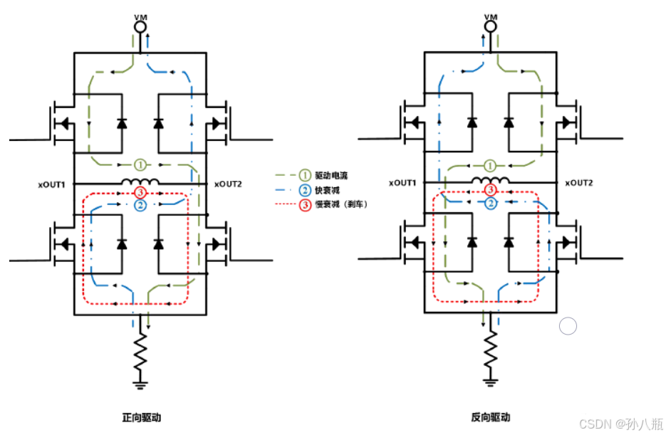正转/慢衰减,正常驱动电流路径为正向驱动①所示,当有刷电机处于慢衰减模式进行制动时,H桥的上下桥功率管关断,下桥功率管均打开ÿ