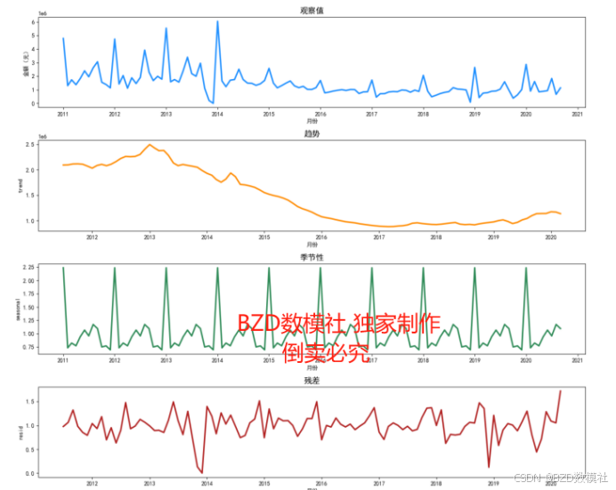 数据显示,销售金额在2013年和2014年出现了明显的高峰。之后的几年中,销售金额总体呈现下降趋势,直到2018年后趋于平稳。从2011年到2017年,销售金额的长期趋势呈下降态势。2017年以后,趋势有所回升,并逐渐趋于平稳。数据显示,每年某些月份的销售金额显著增加,表现出较强的季节性波动。这个季节性模式在各年间基本保持一致。残差部分显示出较大的波动性,但没有明显的系统性趋势。这些波动反映了数据中随机和不可预测的部分。【论文内容:图形文字描述】
