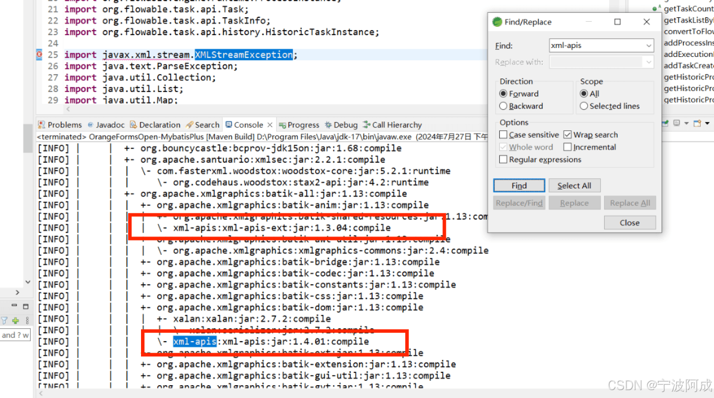 ctrl-shift-t 可以找到这个引入是哪些包里包括的,看到下面有一个xml-apis也包含了,应该需要去掉这个才行