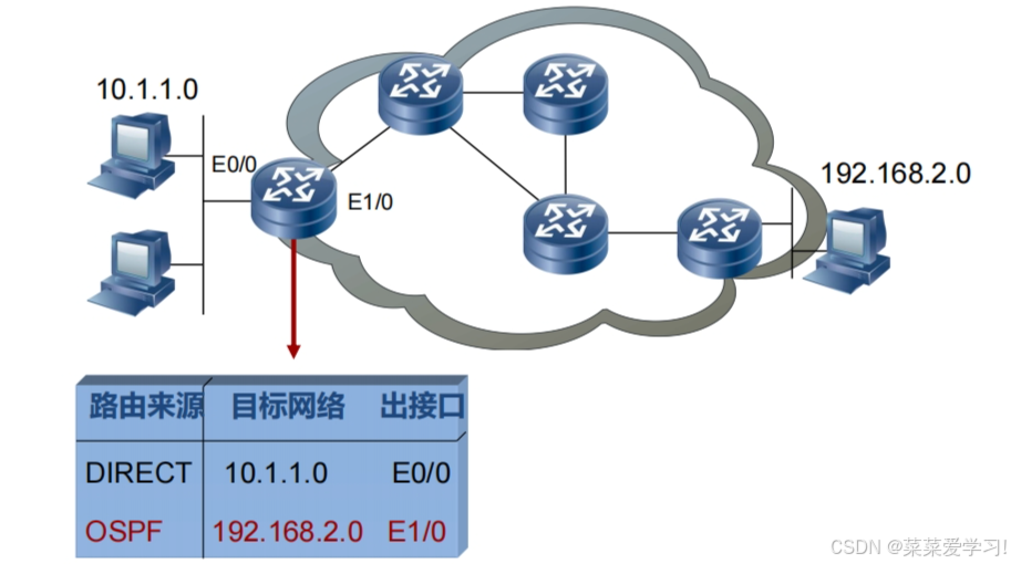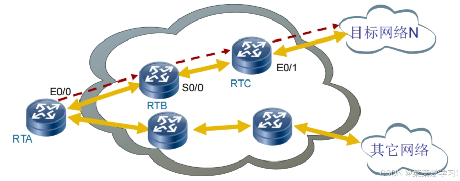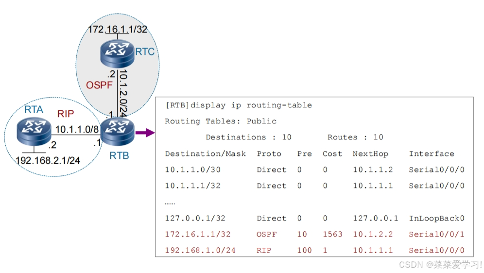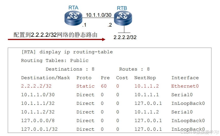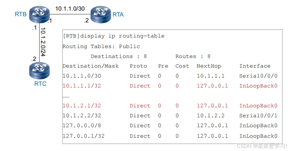 直连路由:直接与路由器相连的路由,像图中的RTA,直接与路由器B相连,路由器B中有一条描述这条直接相连的路由的直连路由,即10.1.1.1.1/32;
