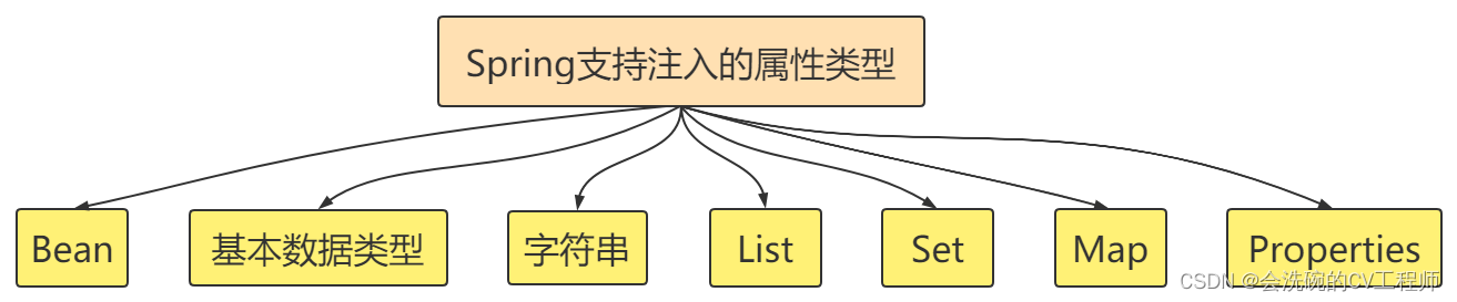 DI支持注入bean类型、基本数据类型和字符串、List集合、Set集合、Map集合、Properties对象类型等,他们的写法如下: