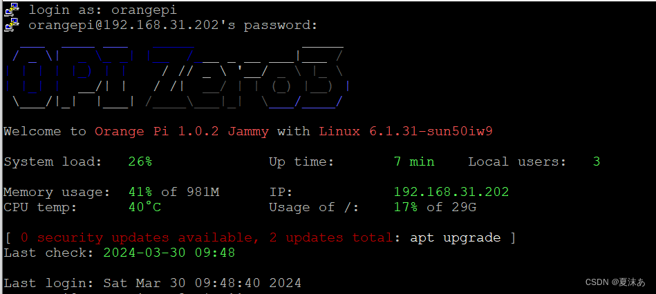 首先开启你的派的ssh,这个由各家派的官方给的东西来确定,你需要自己去查查手上的派的ssh如何打开,这里没办法统一,所以暂不叙述。不过这个ssh打开后,设置成开机时自动启动,就可以做到无显示屏进行控制了,这里我以香橙派的ssh链接做示例,windows使用putty工具进行ssh链接,linux直接使用ssh命令即可。