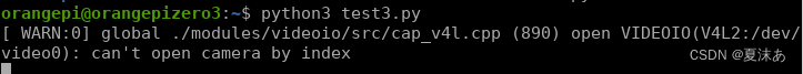 但如果你出现了下图这种情况,也不要慌张,这就是上面所提到的 设备没选对,你去把test3.py的cv2.VideoCapture(0, cv2.CAP_V4L2)改成cv2.VideoCapture(1, cv2.CAP_V4L2)大概率就好了。