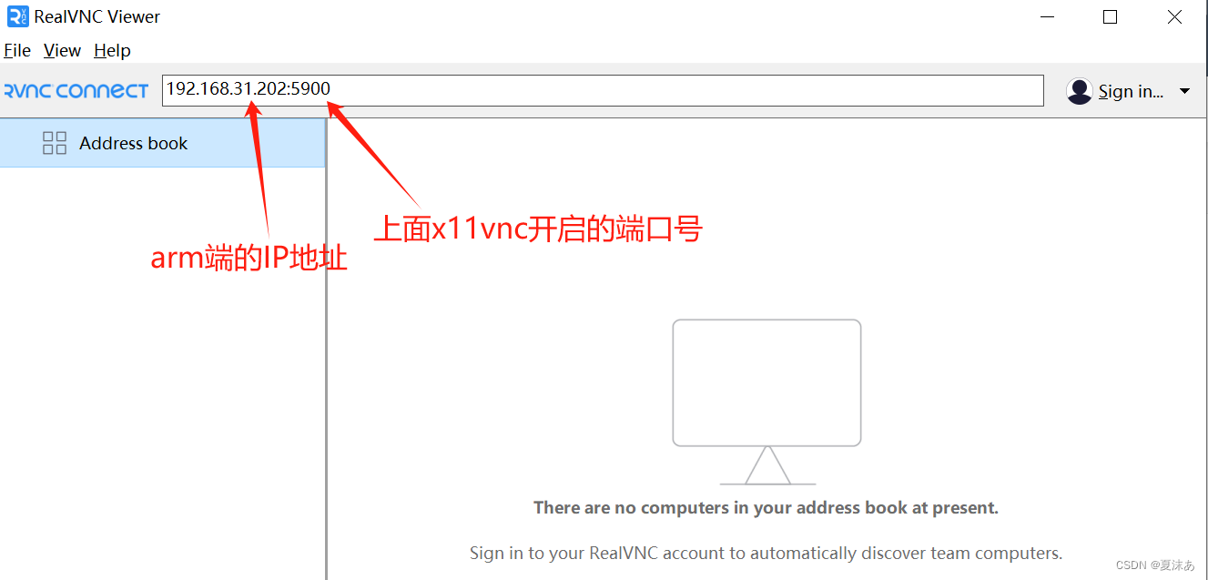 然后你确保arm端x11vnc开启后再打开电脑realvnc客户端,然后按下图配置好后回车即可