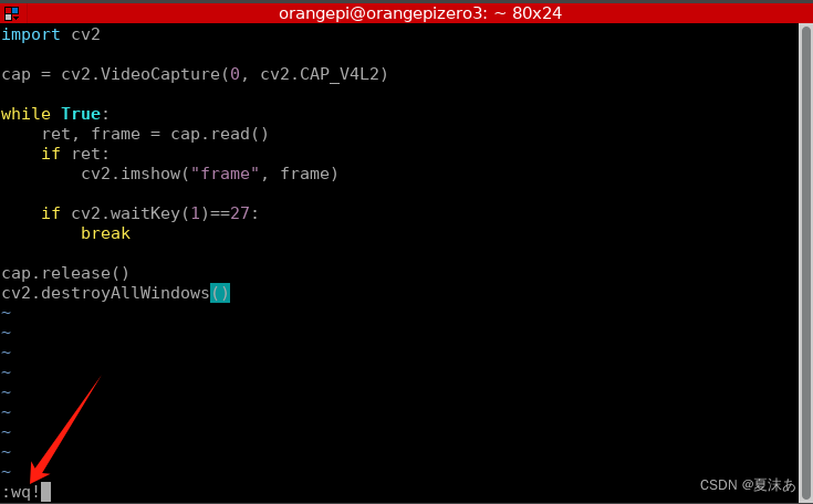 然后多按几次ESC键退出编辑模式 再按shift+: 在终端窗口左下角会显示:你再输入wq! 然后回车 意思是强制 写入 退出 这样你就把上面这串代码添加进了test3.py这个文件里。