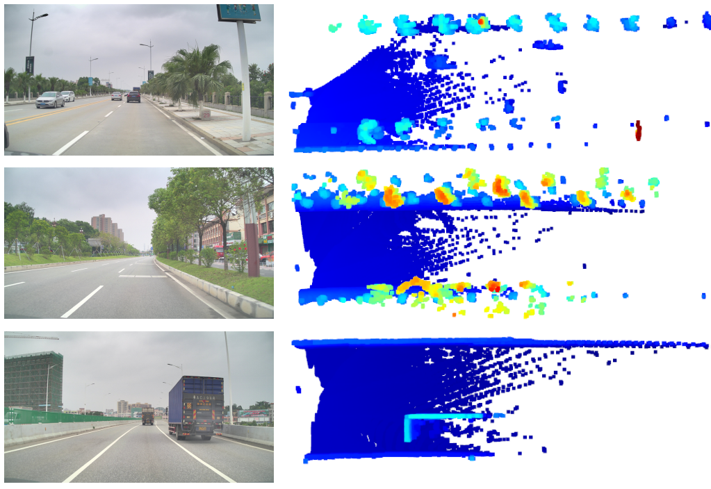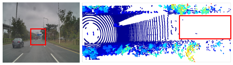如下图所示,激光雷达通常在地面平面上具有较短的有效范围,而摄像头可以看到更远的距离。
