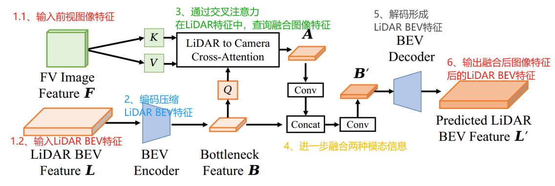 通过融合图像特征,使得图像引导激光雷达远距离BEV特征预测,使用交叉注意力机制实现的。
