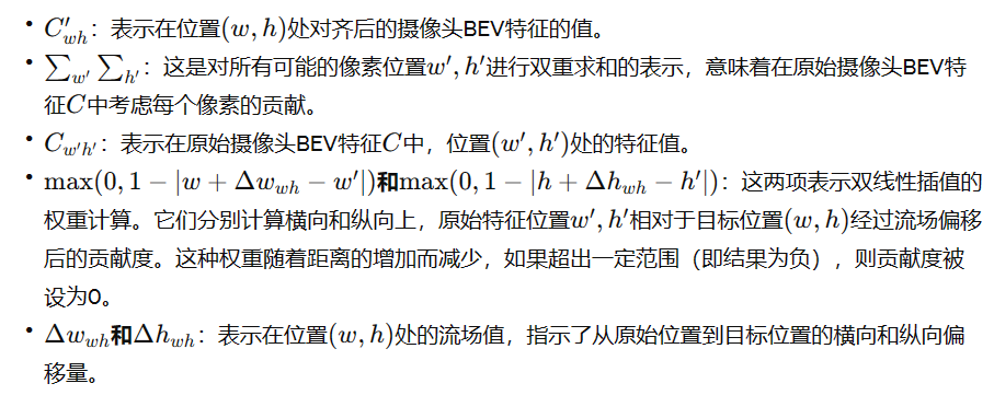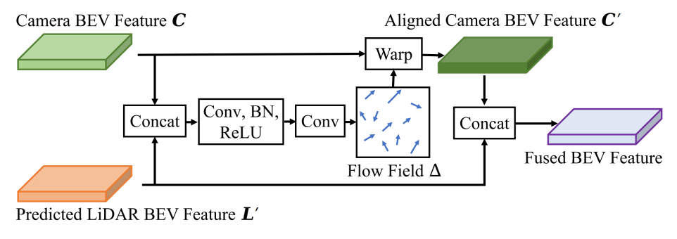 特征对齐:使用流场Flow Field Δ来对摄像头BEV特征C进行空间变换,以对齐到LiDAR BEV特征的参考框架,生成对齐后的摄像头BEV特征C′。这一步骤是关键,因为它确保了两种类型的特征在空间上的一致性,从而使得融合更加有效。