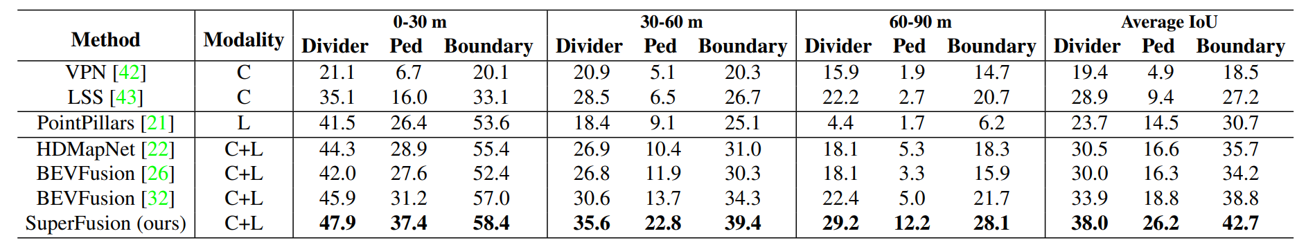 在短距离和长距离HD地图生成方面超越现有最先进方法:SuperFusion在生成高清晰度(HD)地图的短距离和长距离范围内都显著优于现有的融合方法。这一点特别重要,因为它不仅显示了该方法在技术上的进步,还证明了它在实际应用中的可行性和效用,尤其是在需要精确长距离感知的自动驾驶场景中。
