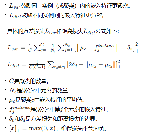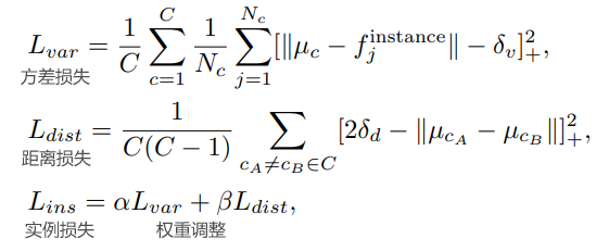 实例嵌入:实例嵌入预测的损失定义为方差损失和距离损失的组合,通过参数α和β加权。
