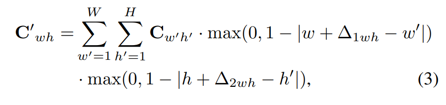 通过流场Δ对齐摄像头的BEV特征C到激光雷达的BEV特征L′,用公式表示:
