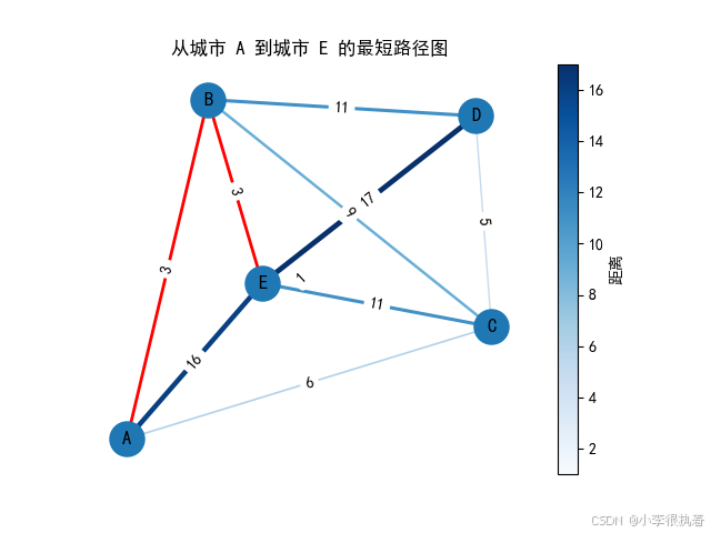 (2)绘制结果应包含所有节点(城市)和表示最短路径的边,边的粗细或颜色可以表示距离长短。