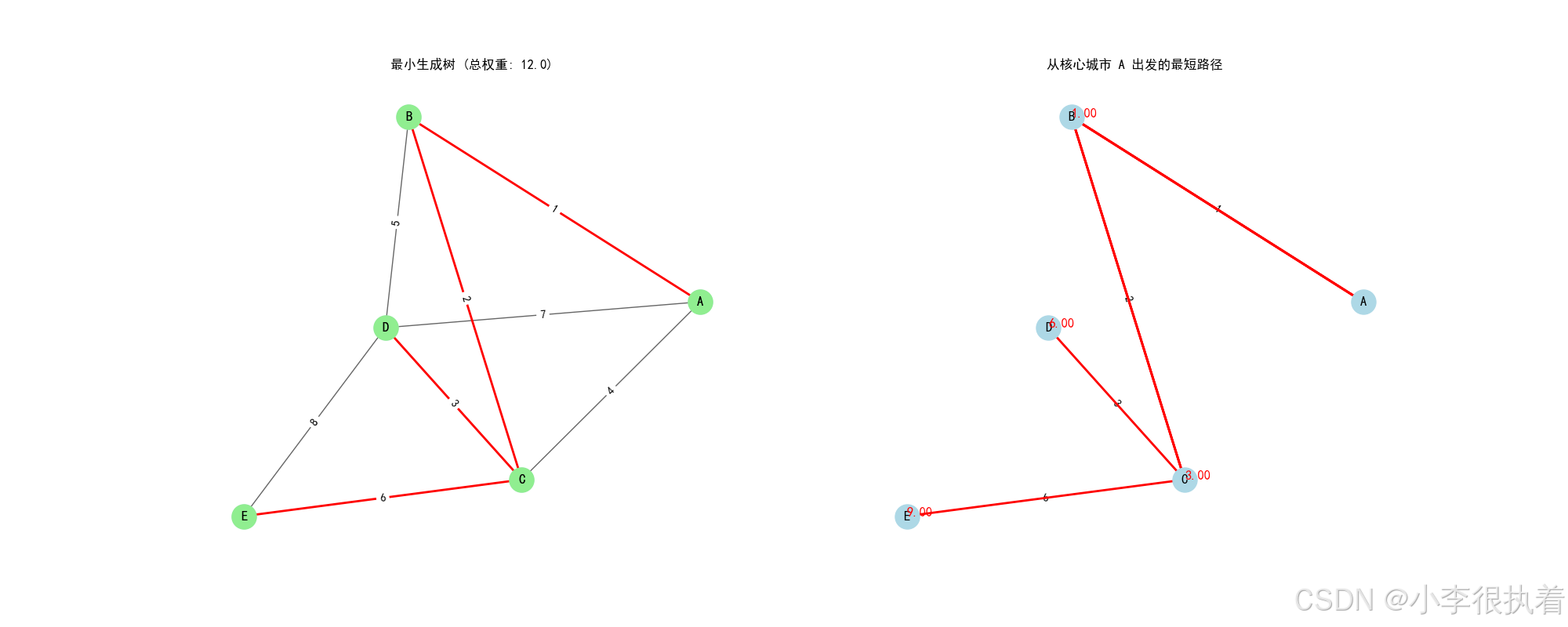 这三个问题分别涉及图论中的最短路径问题、最小生成树问题以及结合这两种方法的复杂网络分析。第一个问题使用Dijkstra算法计算并可视化了从一个指定城市到其他所有城市的最短路径,第二个问题使用Kruskal算法找到并绘制了一个无向带权图的最小生成树,第三个问题在最小生成树的基础上,使用Dijkstra算法计算并展示了从核心城市到其他所有城市的最短路径。每个问题都结合了图的构建、算法的应用和结果的可视化。