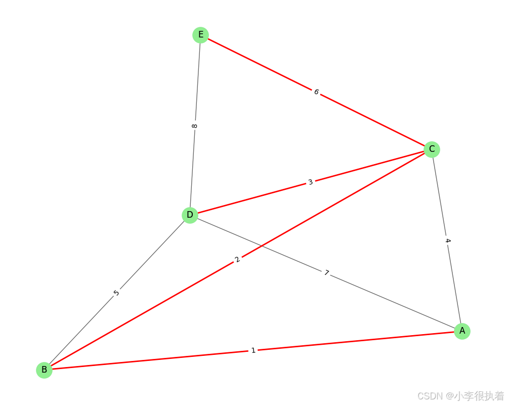 import networkx as nx import matplotlib.pyplot as plt # 边列表,每个元素是一个三元组(起点 终点 权重) edges = [ ('A', 'B', 1), ('A', 'C', 4), ('A', 'D', 7), ('B', 'C', 2), ('B', 'D', 5), ('C', 'D', 3), ('C', 'E', 6), ('D', 'E', 8) ] # 构建图 G = nx.Graph() G.add_weighted_edges_from(edges) # 使用Kruskal算法计算MST mst = nx.minimum_spanning_tree(G, algorithm='kruskal') # 绘制图 pos = nx.spring_layout(G) plt.figure(figsize=(10, 8)) # 绘制原始图 nx.draw(G, pos, with_labels=True, node_size=500, node_color="lightblue", alpha=0.6) labels = nx.get_edge_attributes(G, 'weight') nx.draw_networkx_edge_labels(G, pos, edge_labels=labels) # 绘制MST nx.draw(mst, pos, with_labels=True, node_size=500, node_color="lightgreen", edge_color="red", width=2) labels_mst = nx.get_edge_attributes(mst, 'weight') nx.draw_networkx_edge_labels(mst, pos, edge_labels=labels_mst) # 计算MST的总权重 total_weight = mst.size(weight='weight') plt.title(f"Minimum Spanning Tree (Total Weight: {total_weight})") plt.show()