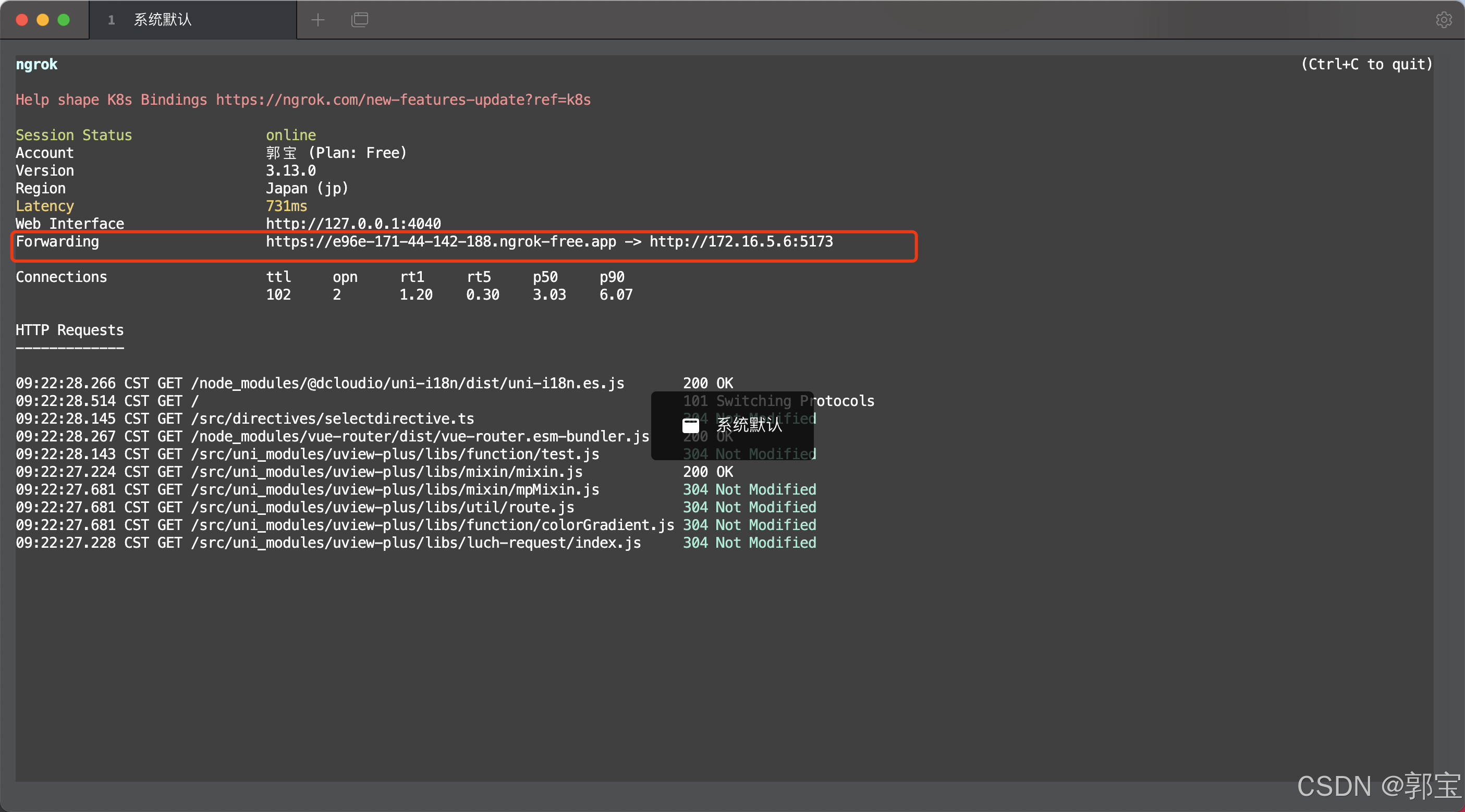 动态域名:Ngrok 提供了一个动态域名系统,即使你的本地IP地址或端口改变,外部用户也可以继续使用相同的URL访问你的服务。