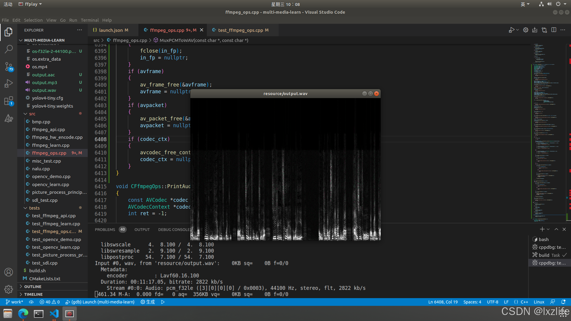 void CFfmpegOps::MuxPCMToWAV(const char* pcm_file, const char* wav_file) { const AVOutputFormat* out_fmt = nullptr; AVFormatContext* fmt_ctx = nullptr; const AVCodec* codec = nullptr; AVCodecContext* codec_ctx = nullptr; AVStream* avstream = nullptr; AVPacket* avpacket = nullptr; AVFrame* avframe = nullptr; int ret = -1; FILE* in_fp = nullptr; int sample_fmt_is_planar = 0; size_t n = 0; int frame_data_bytes = 0; codec = avcodec_find_encoder(AV_CODEC_ID_PCM_F32LE); if (!codec) { printf("avcodec_find_encoder error\n"); goto END; } codec_ctx = avcodec_alloc_context3(codec); if (!codec_ctx) { printf("avcodec_alloc_context3 error\n"); goto END; } codec_ctx->sample_fmt = AV_SAMPLE_FMT_FLT; // f32le codec_ctx->sample_rate = 44100; codec_ctx->channel_layout = AV_CH_LAYOUT_STEREO; codec_ctx->channels = av_get_channel_layout_nb_channels(codec_ctx->channel_layout); ret = avcodec_open2(codec_ctx, codec, nullptr); if (ret < 0) { printf("avcodec_open2 error(%s)\n", GetFfmpegERR(ret)); goto END; } printf("frame_size:%d\n", codec_ctx->frame_size); avframe = av_frame_alloc(); if (!avframe) { printf("av_frame_alloc error\n"); goto END; } avframe->format = AV_SAMPLE_FMT_FLT; avframe->sample_rate = 44100; avframe->channel_layout = AV_CH_LAYOUT_STEREO; avframe->channels = av_get_channel_layout_nb_channels(avframe->channel_layout); avframe->nb_samples = 1024; ret = av_frame_get_buffer(avframe, 0); if (ret < 0) { printf("av_frame_get_buffer error(%s)\n", GetFfmpegERR(ret)); goto END; } ret = av_samples_get_buffer_size(nullptr, avframe->channels, avframe->nb_samples, (AVSampleFormat)(avframe->format), 1); if (ret < 0) { printf("av_samples_get_buffer_size error(%s)\n", GetFfmpegERR(ret)); goto END; } frame_data_bytes = ret; avpacket = av_packet_alloc(); if (!avpacket) { printf("av_packet_alloc error\n"); goto END; } in_fp = fopen(pcm_file, "rb"); if (!in_fp) { printf("fopen error\n"); goto END; } ret = avformat_alloc_output_context2(&fmt_ctx, nullptr, nullptr, wav_file); if (ret < 0) { printf("avformat_alloc_output_context2 error(%s)\n", GetFfmpegERR(ret)); goto END; } out_fmt = fmt_ctx->oformat; avstream = avformat_new_stream(fmt_ctx, codec); if (!avstream) { printf("avformat_new_stream error\n"); goto END; } ret = avcodec_parameters_from_context(avstream->codecpar, codec_ctx); if (ret < 0) { printf("avcodec_parameters_from_context error(%s)\n", GetFfmpegERR(ret)); goto END; } ret = avio_open(&(fmt_ctx->pb), wav_file, AVIO_FLAG_READ_WRITE); if (ret < 0) { printf("avio_open error(%s)\n", GetFfmpegERR(ret)); goto END; } ret = avformat_write_header(fmt_ctx, nullptr); if (ret < 0) { printf("avformat_write_header error(%s)\n", GetFfmpegERR(ret)); goto END; } while (1) { if (feof(in_fp)) { break; } sample_fmt_is_planar = av_sample_fmt_is_planar((AVSampleFormat)(avframe->format)); if (sample_fmt_is_planar) { n = fread(avframe->data[0], sizeof(uint8_t), frame_data_bytes / 2, in_fp); if ((int)n != (frame_data_bytes / 2)) { printf("n != (frame_data_bytes / 2)\n"); } n = fread(avframe->data[1], sizeof(uint8_t), frame_data_bytes / 2, in_fp); if ((int)n != (frame_data_bytes / 2)) { printf("n != (frame_data_bytes / 2)\n"); } } else { n = fread(avframe->data[0], sizeof(uint8_t), frame_data_bytes, in_fp); if ((int)n != frame_data_bytes) { printf("n != (frame_data_bytes)\n"); } } ret = avcodec_send_frame(codec_ctx, avframe); if (ret < 0) { if (ret == AVERROR(EAGAIN)) { printf("read output first\n"); } else { printf("avcodec_send_frame error(%s)\n", GetFfmpegERR(ret)); break; } } while (1) { ret = avcodec_receive_packet(codec_ctx, avpacket); if (ret < 0) { if (ret == AVERROR(EAGAIN)) { printf("send input first\n"); break; } else { printf("avcodec_receive_packet error(%s)\n", GetFfmpegERR(ret)); break; } } ret = av_write_frame(fmt_ctx, avpacket); if (ret < 0) { printf("av_write_frame error(%s)\n", GetFfmpegERR(ret)); av_packet_unref(avpacket); goto END; } av_packet_unref(avpacket); } } ret = avcodec_send_frame(codec_ctx, nullptr); while (1) { ret = avcodec_receive_packet(codec_ctx, avpacket); if (ret < 0) { if (ret == AVERROR(EAGAIN)) { printf("send input first\n"); break; } else { printf("avcodec_receive_packet error(%s)\n", GetFfmpegERR(ret)); break; } } ret = av_write_frame(fmt_ctx, avpacket); if (ret < 0) { printf("av_write_frame error(%s)\n", GetFfmpegERR(ret)); av_packet_unref(avpacket); goto END; } av_packet_unref(avpacket); } ret = av_write_trailer(fmt_ctx); if (ret < 0) { printf("av_write_trailer error(%s)\n", GetFfmpegERR(ret)); goto END; } END: if (fmt_ctx) { avformat_free_context(fmt_ctx); fmt_ctx = nullptr; } if (in_fp) { fclose(in_fp); in_fp = nullptr; } if (avframe) { av_frame_free(&avframe); avframe = nullptr; } if (avpacket) { av_packet_free(&avpacket); avpacket = nullptr; } if (codec_ctx) { avcodec_free_context(&codec_ctx); codec_ctx = nullptr; } }