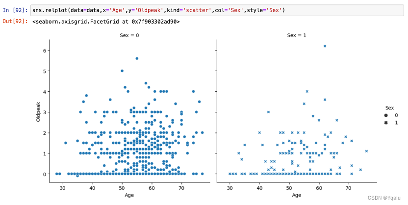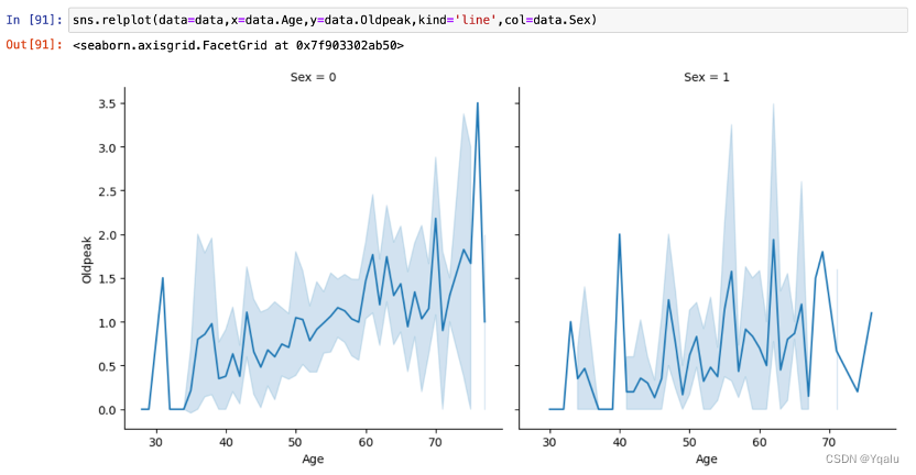Oldpeak slightly showed an upward trend with the increase of age, and the increasing trend of female is lower than that of male.