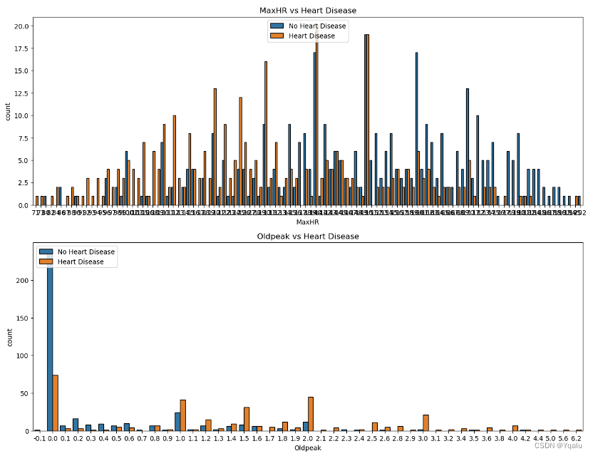 For the MaxHR readings, heart diseases are found throughout the data but 70 (14x5) - 180 (36x5) values has detected many cases.