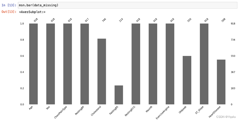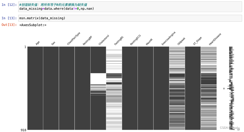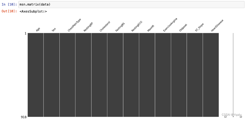 Apparently, the dataset has 918 rows and 12 columns, with no missing values overall. As a trial, this report will replace all data with values of 0 by missing values, in order to better demonstrate the effects of a dataset with missing values as well as the use of missingno library.