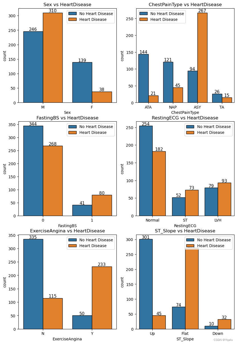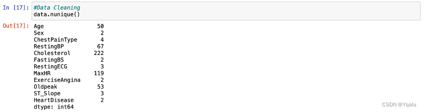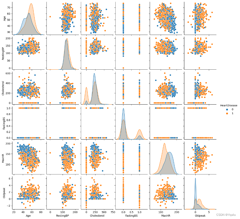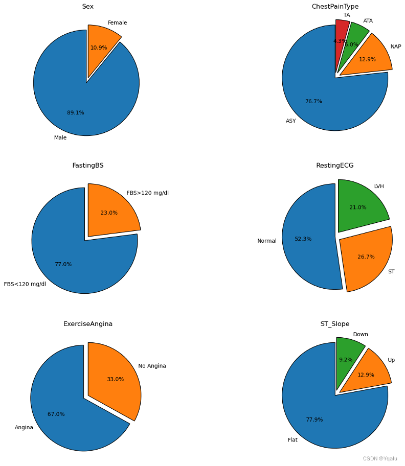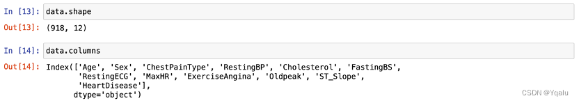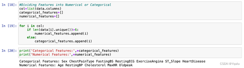 According to the output, seven features —— “Sex”, “ChestPainType”, “FastingBS”, “RestingECG”, “ExerciseAngina”, “ST_Slope” and “HeartDisease” —— belong to categorical features, and five features —— “Age”, “RestingBP”, “Cholesterol”, “MaxHR” and “Oldpeak” —— belong to numerical features.