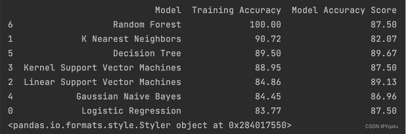 models = pd.DataFrame({ 'Model':[ 'Logistic Regression','K Nearest Neighbors','Linear Support Vector Machines', 'Kernel Support Vector Machines', 'Gaussian Naive Bayes','Decision Tree', 'Random Forest' ], 'Training Accuracy':[ lr_train_acc,knn_train_acc,svm_train_acc,svm_k_train_acc,nb_train_acc,tree_train_acc,rdm_train_acc ], 'Model Accuracy Score':[ lr_test_acc,knn_test_acc,svm_test_acc,svm_k_test_acc,nb_test_acc,tree_test_acc,rdm_test_acc ] }) print(models.sort_values(by='Training Accuracy',ascending=False)) Output: