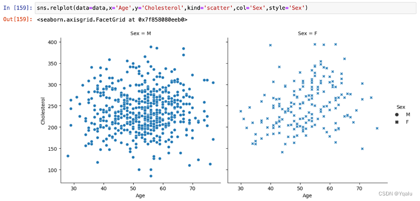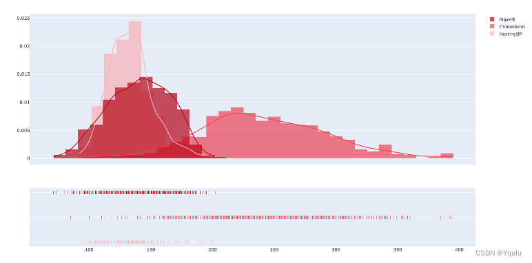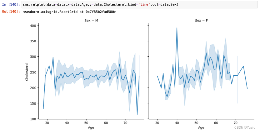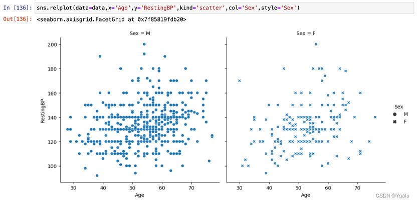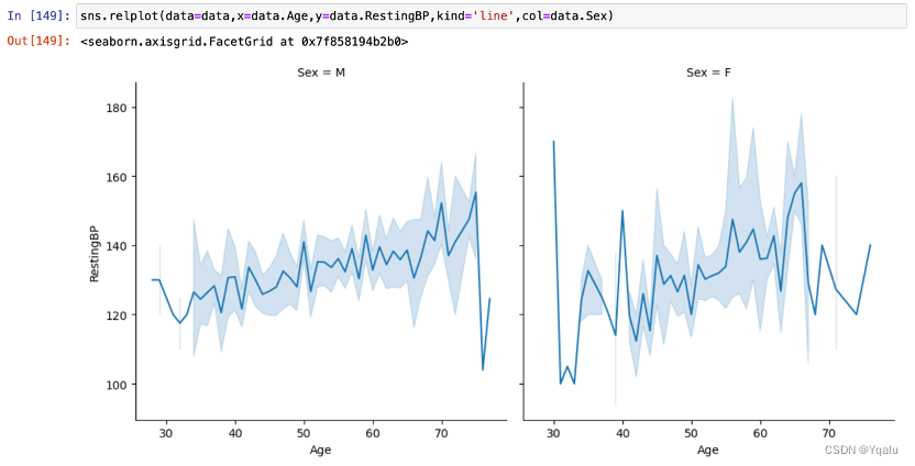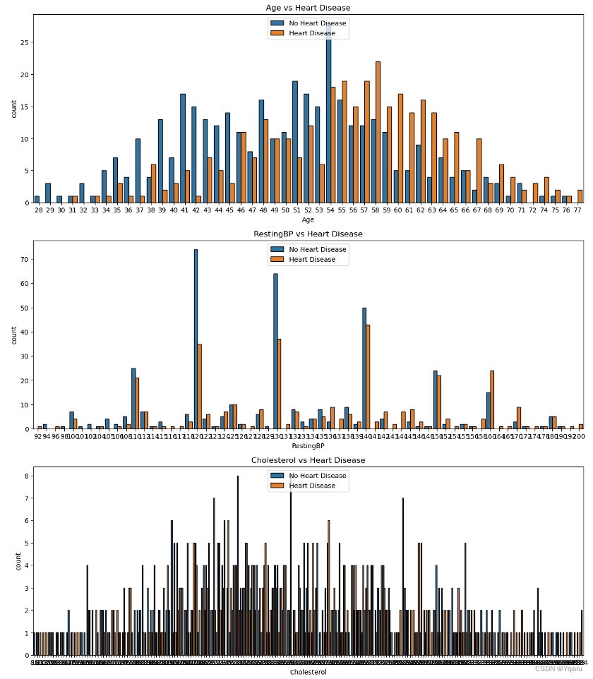 With the increase of age, the RestingBP also shows an increasing trend. Besides, the RestingBP of women in the same age group is slightly lower than that of man.