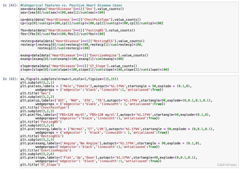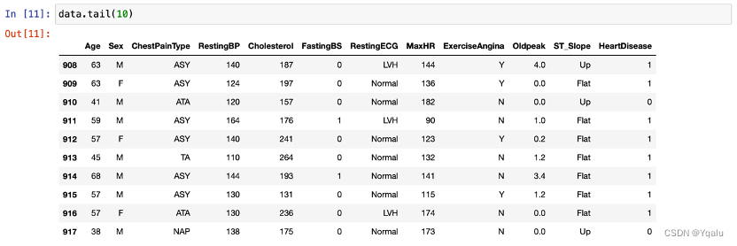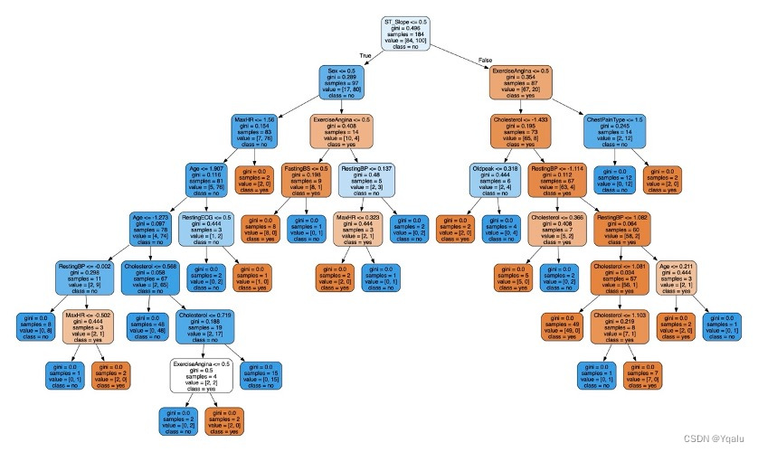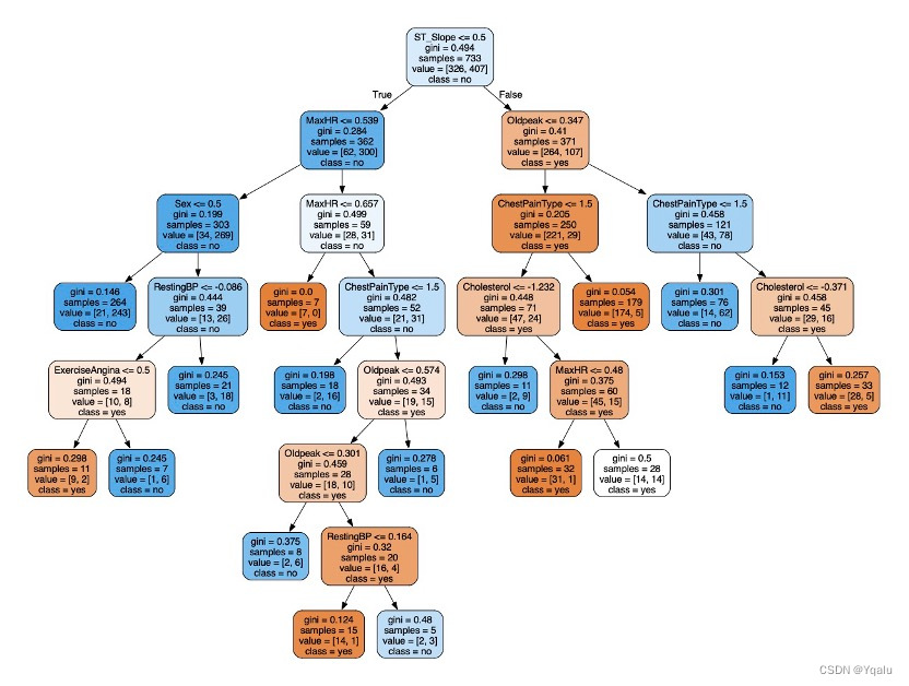 feature_name=['Age','Sex','ChestPainType','RestingBP','Cholesterol','FastingBS','RestingECG','MaxHR','ExerciseAngina','Oldpeak','ST_Slope'] print([*zip(feature_name,clf.feature_importances_)]) Output: