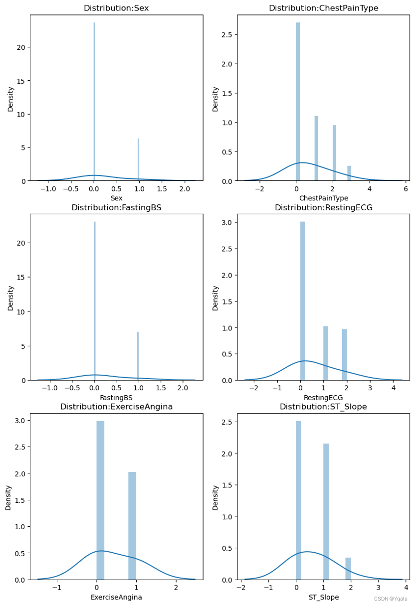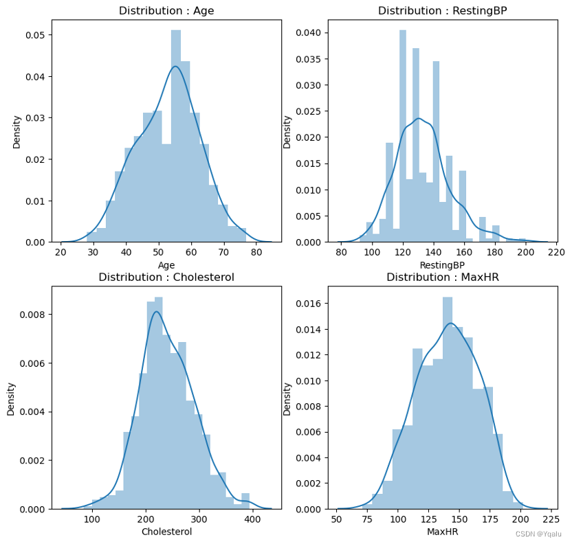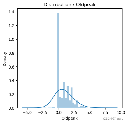 The result confirms our hypothesis that Oldpeak is, indeed, right-skewed while other features fit the normal distribution.