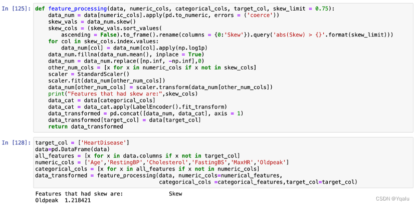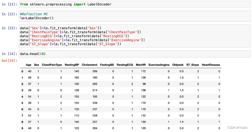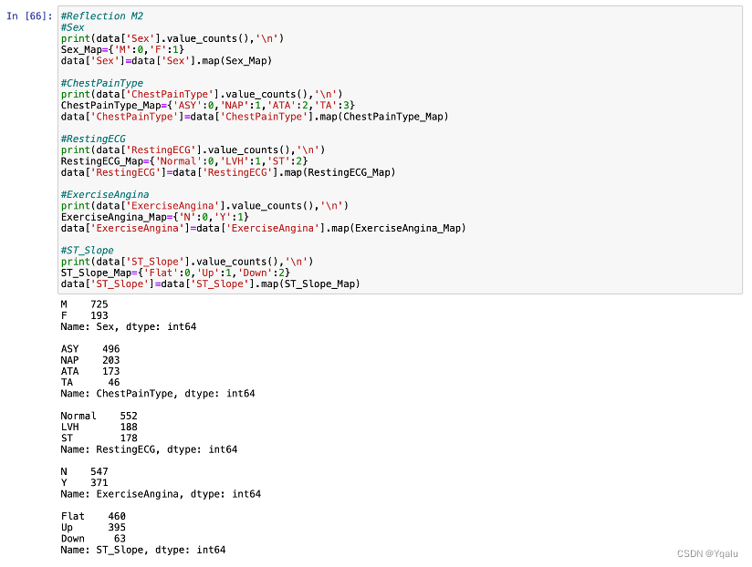 Take the ChestPainType as an example. value_counts() function is used to obtain the frequency of each value and the result shows that there are four values in ChestPainType, which is “ASY”, “NAP”, “ATA”, and “TA”. Then, we can build a mapping dictionary to replace the original data with 0, 1, 2 and 3. Other features are similarly mapped.
