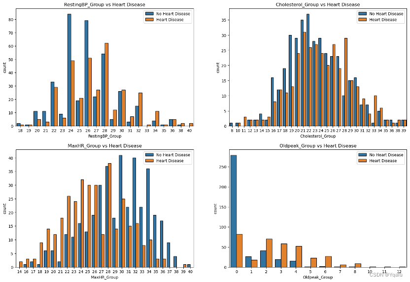 From the RestingBP group data, 95 (19x5) - 170 (34x5) readings are most prone to be detected with heart diseases.