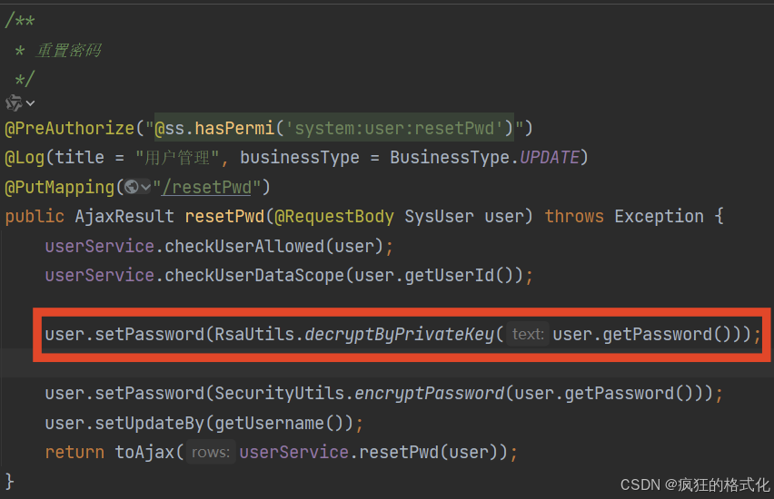 在 admin 模块下的 com.uam.web.controller.system 包中 SysUserController 类中的 resetPwd 方法中添加下面一行代码,对前端传过来的加密密码进行解密。