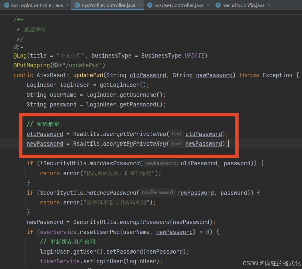 在 admin 模块下的 com.uam.web.controller.system 包中 SysProfileController 类中的 updatePwd 方法中添加下面两行代码,对前端传过来的加密密码进行解密。