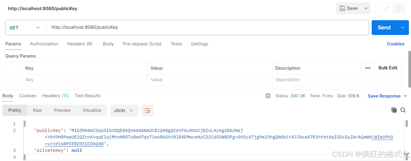 可以使用 Postman 来测试刚刚的 publicKey 接口能否成功被调用。端口号如果没有进行修改默认为 8080。