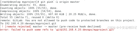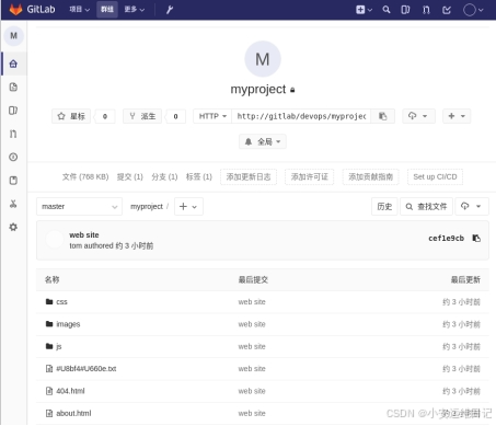 [root@develop ~]# git config --global user.name "tom" [root@develop ~]# git config --global user.email "tom@qq.com" [root@develop ~]# cat .gitconfig //用户标记信息 [user] email = tom@qq.com name = tom [root@develop ~]# git clone http://192.168.4.20/devops/myproject.git # 解释:克隆devops组下的仓库myproject(.git类似后缀,可忽略) [root@develop ~]# cd myproject/ [root@develop myproject]# ls -a . .. .git [root@develop myproject]# touch README.md [root@develop myproject]# git add README.md [root@develop myproject]# git commit -m "Add README" [root@develop myproject]# git push -u origin master Username for 'http://192.168.4.20': tom //输入账户 Password for 'http://tom@192.168.4.20': //输入密码
