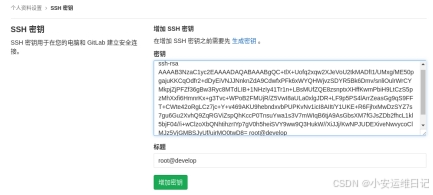 点击右上角账户图标,点【设置】,点击【SSH密钥】,将develop主机生成的密钥文件/root/.ssh/id_rsa.pub内容复制到GitLab上面;(不能重复上传)
