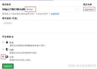 2)设置项目路径(组名称devops)、项目仓库名称(仓库myproject)、可见等级(公开)