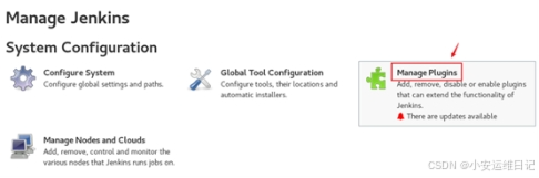 2)插件管理,打开【Manage Jenkins】,找到【Manage Plugins】