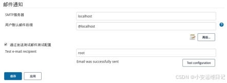 通过发送测试邮件测试配置,测试结果为 Email was successfully sent