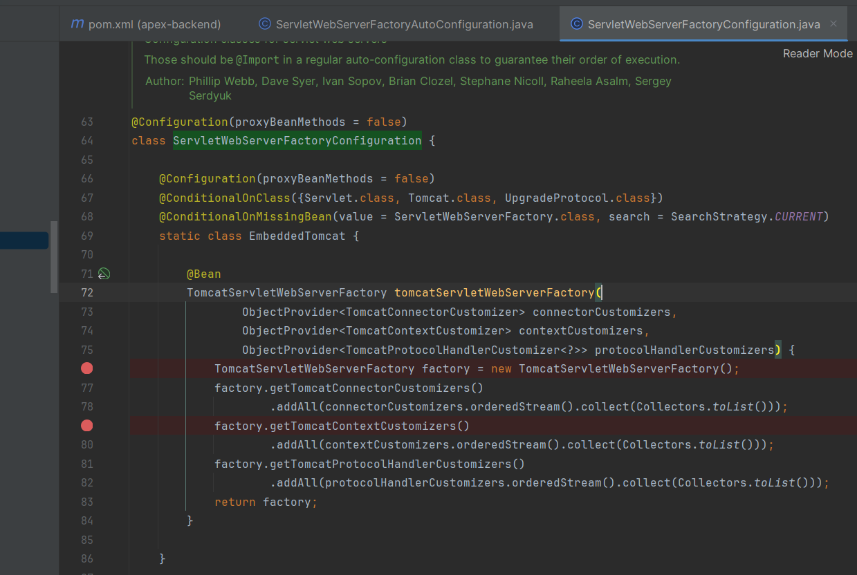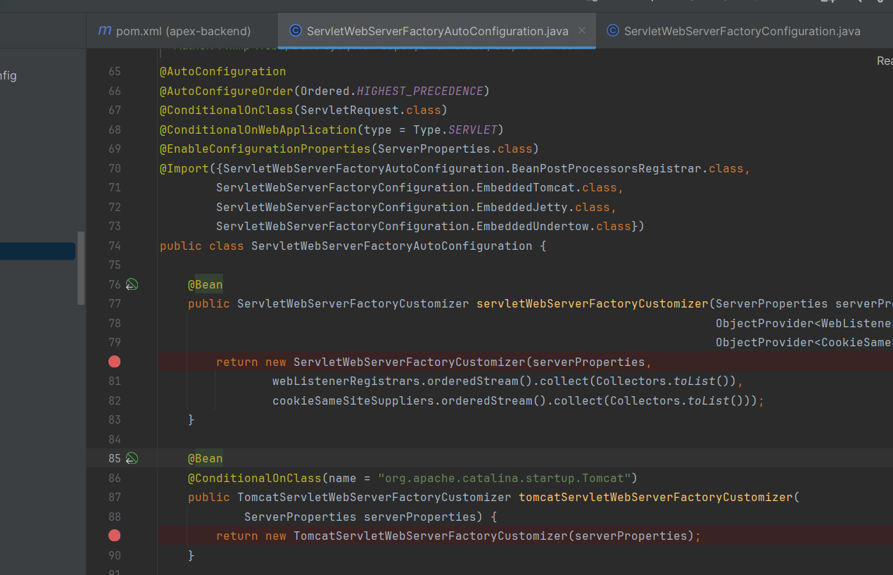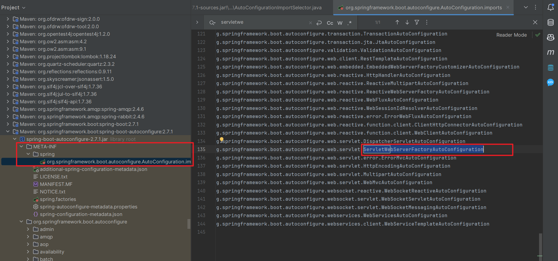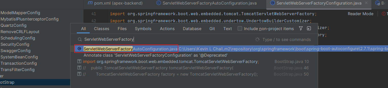 再次全局搜索怀疑可能是自动装配的类org.springframework.boot.autoconfigure.web.servlet.ServletWebServerFactoryAutoConfiguration