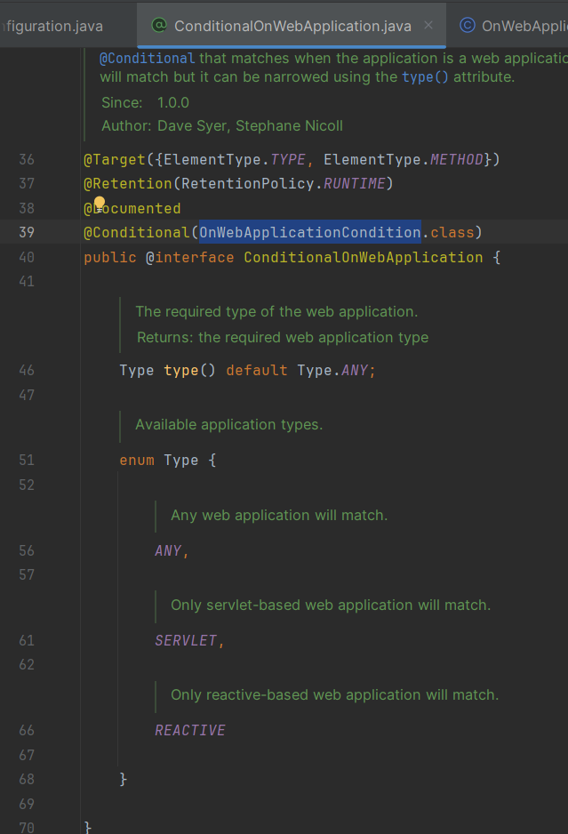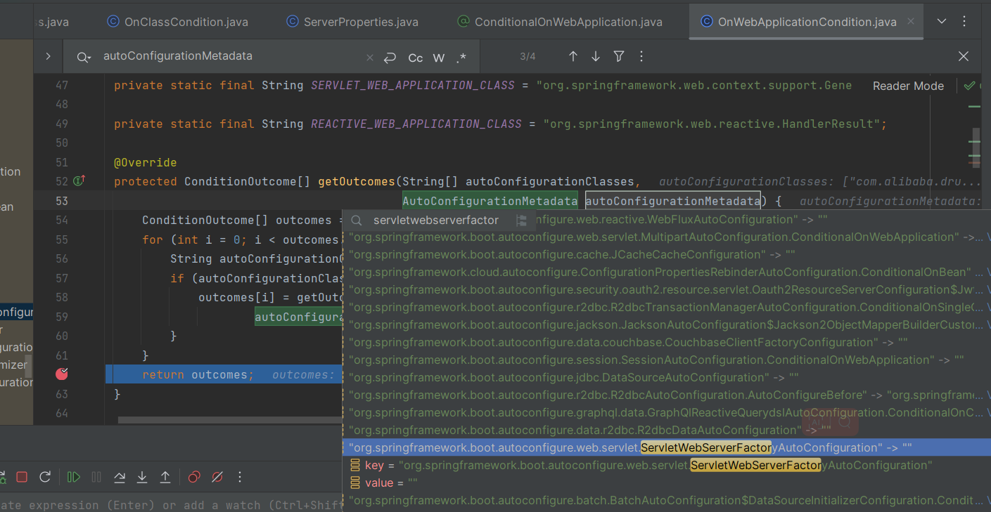 再次尝试debug发现依然没有走到,继续思考查看类上方相关的Conditional注解条件是否满足,猜测可能是@ConditionalOnWebApplication(type = Type.SERVLET)