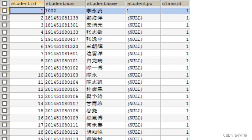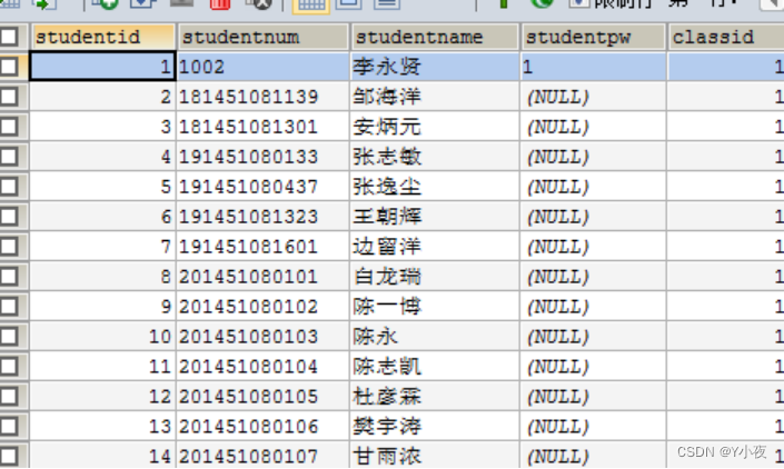 5. 在`if`语句的代码块中,使用`insert into student(`studentnum`,`studentname`,`studentpw`,`classid`) value(num0 ,name0,pw0,classid0);`语句向"student"表中插入一条新的记录。其中,`num0`、`name0`、`pw0`和`classid0`分别对应输入参数的学生编号、姓名、密码和班级ID。
