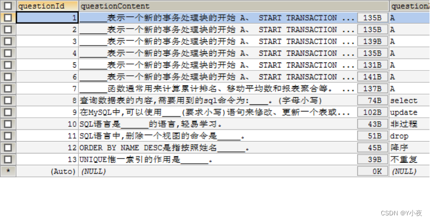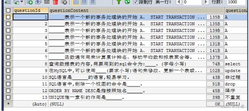 insert into `questionbank`(`questionId`,`questionContent`,`questionAnswer`,`type`,`difficulty`,`chapterId`) values (1,'______表示一个新的事务处理块的开始 \nA、 START TRANSACTION \nB、 BEGIN TRANSACTION \nC、 BEGIN COMMIT \nD、 START COMMIT ','A',001,001,1),(2,'______表示一个新的事务处理块的开始 \nA、 START TRANSACTION \nB、 BEGIN TRANSACTION \nC、 BEGIN COMMIT \nD、 START COMMIT ','A',001,001,1),(3,'______表示一个新的事务处理块的开始 \r\nA、 START TRANSACTION \r\nB、 BEGIN TRANSACTION \r\nC、 BEGIN COMMIT \r\nD、 START COMMIT ','A',001,001,1),(4,'______表示一个新的事务处理块的开始 \nA、 START TRANSACTION \nB、 BEGIN TRANSACTION \nC、 BEGIN COMMIT \nD、 START COMMIT ','A',001,001,1),(5,'______表示一个新的事务处理块的开始 A、 START TRANSACTION B、 BEGIN TRANSACTION C、 BEGIN COMMIT D、 START COMMIT ','A',001,001,1),(6,'______表示一个新的事务处理块的开始 \r\nA、 START TRANSACTION \r\nB、 BEGIN TRANSACTION \r\nC、 BEGIN COMMIT \r\nD、 START COMMIT \r\n','A',001,001,1),(7,'______函数通常用来计算累计排名、移动平均数和报表聚合等。 \r\nA、 汇总 \r\nB、 分析 \r\nC、 分组 \r\nD、 单行','A',001,001,1),(8,'查询数据表的内容,需要用到的sql命令为:____。(字母小写)','select',002,001,1),(9,'在MySQL中,可以使用____(要求小写)语句来修改、更新一个表或多个表中的数据。','update',002,001,1),(10,'SQL语言是______的语言,轻易学习。','非过程',002,001,1),(11,'SQL语言中,删除一个视图的命令是_____。','drop',002,001,1),(12,'ORDER BY NAME DESC是指按照姓名______。','降序',002,001,1),(13,'UNIQUE惟一索引的作用是______。','不重复',002,001,1);