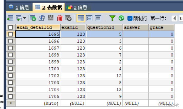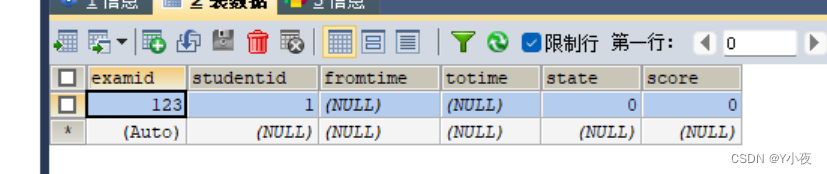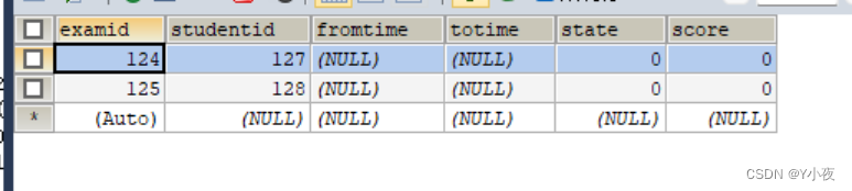 - 使用`insert into`语句向`exam`表中插入一条新的记录,设置学生ID、状态和分数。