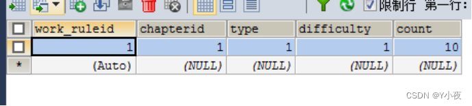 INSERT INTO`word_rule`(`work_ruleid`,`chapterid`,`type`,`difficulty`,`count`) VALUES(1,1,1,1,10);