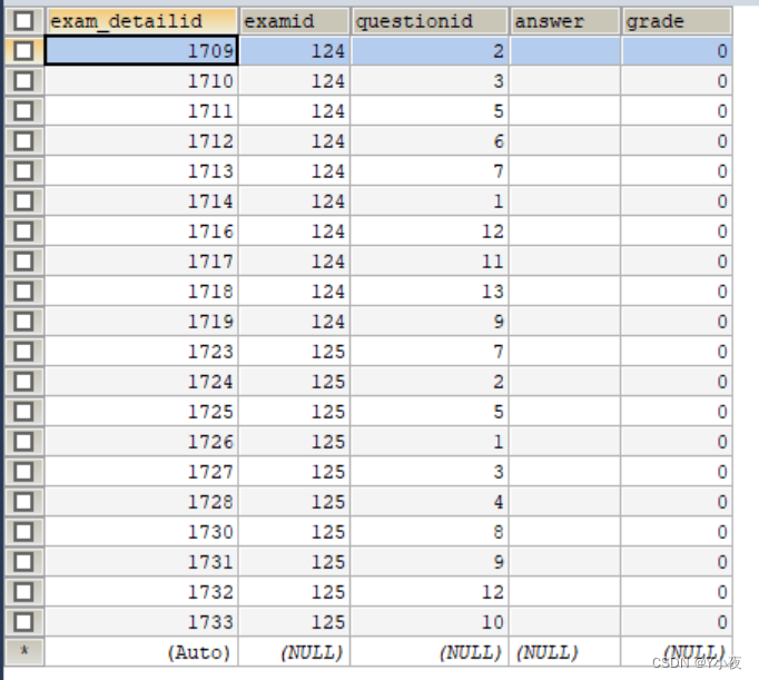 - 使用`insert into`语句向`exam_detail`表中插入多条记录,每条记录包含考试ID、问题ID、答案和成绩。这些记录是根据条件从`questionbank`表中随机选择的,条件包括章节ID范围、类型和难度等。