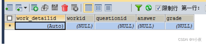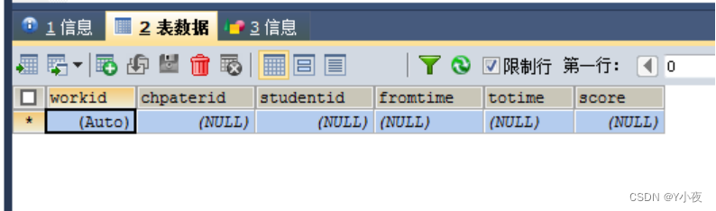 CREATE TABLE `work` ( `workid` int(11) NOT NULL AUTO_INCREMENT, `chpaterid` int(11) DEFAULT NULL, `studentid` int(11) DEFAULT NULL, `fromtime` datetime DEFAULT NULL, `totime` datetime DEFAULT NULL, `score` int(11) DEFAULT NULL, PRIMARY KEY (`workid`) ) ENGINE=InnoDB DEFAULT CHARSET=utf8;